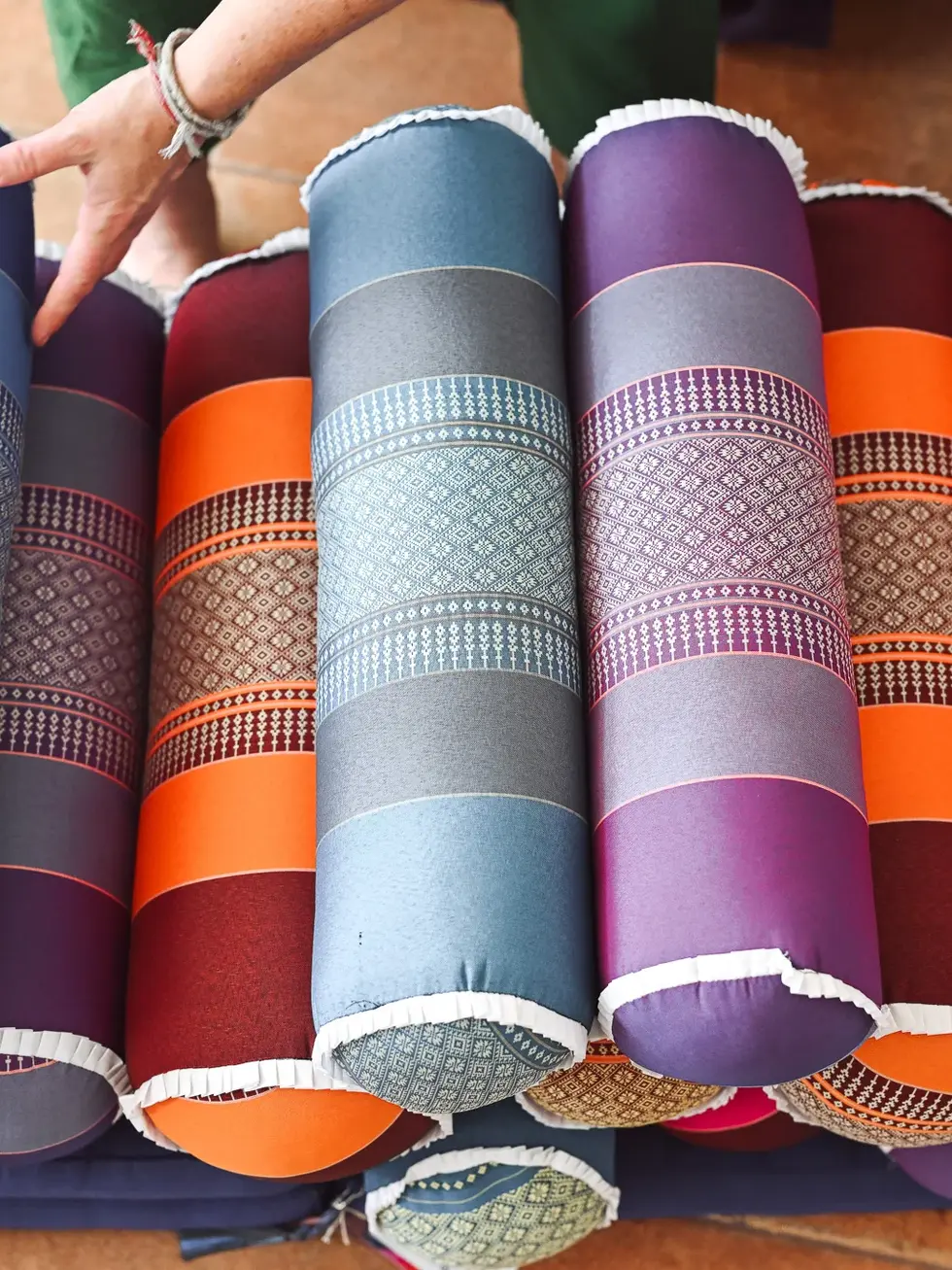 The cushions are Lai Thai style, colorful fabric designs, and are kapok filled to ensure long lasting firmness. To make sure that the triangular cushions remain in shape and serve their purpose, they are stitched and stuffed in a simple manner. They consist of small triangles, each supporting and bracing the others. Most common and typical among Thai pillows and cushions is the mon khwan, literally axe pillow, with reference to its triangular shape, resembling the blade of an axe, it is a supportive cushion for those sitting on the floor.